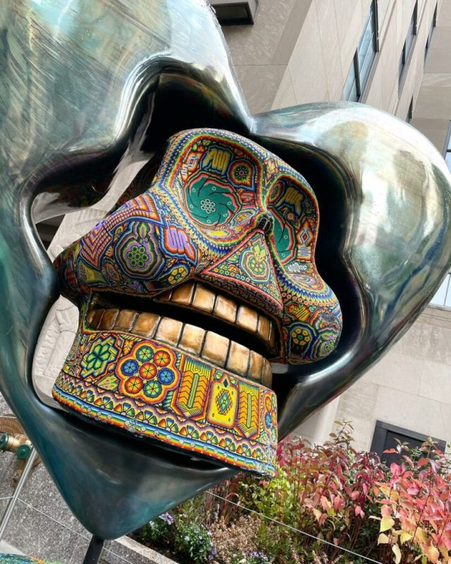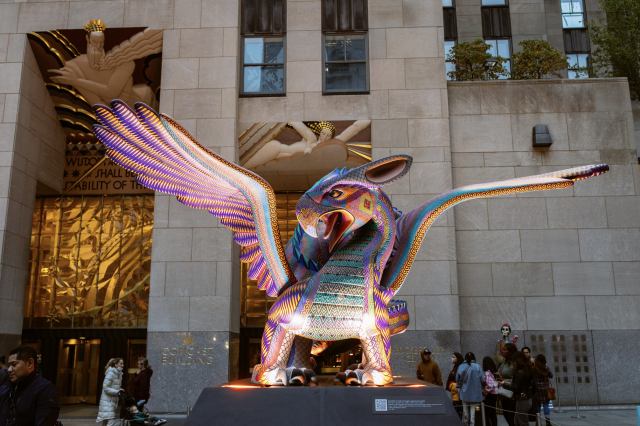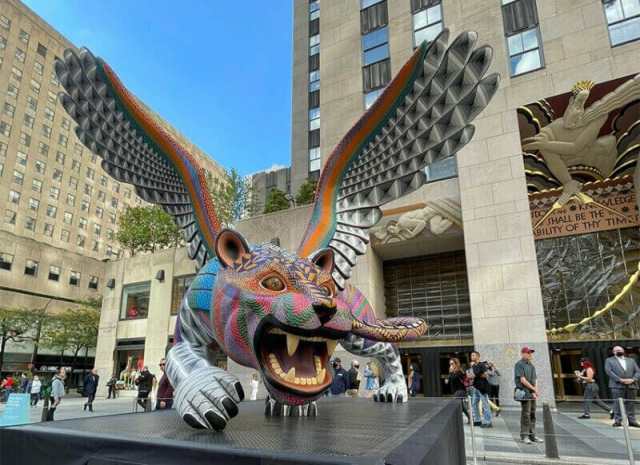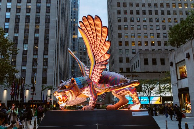 This year, visitors to New York City’s famed Rockefeller Center can see a fabulous exhibtion of Día de los Muertos related Mexican folk art. Works by Atelier Jacobo and María Angeles in Oaxaca and by Menchaca Studio, a Mexico City-based organization specializing in Huichol art and crafts, will be on display. Among the colorful works are two towering alebrijes, vibrantly-colored sculptures of animals and mythical creatures meant to serve as spiritual guides: an 11-foot dragon and a 13.5-foot feathered jaguar, both rendered in fiberglass.