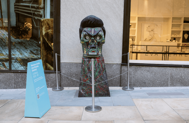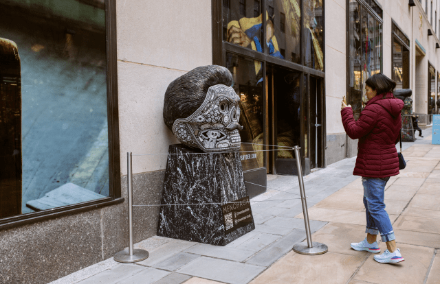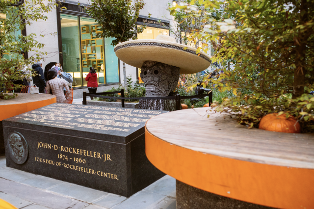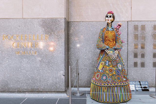 At the entrance to the world famous 30 Rockefeller Plaza are two catrinas, skeleton figures representing the Aztec goddess Mictecacihuatl, by Menchaca Studio. The elegant skulls donning floral hats are perhaps the most recognizable symbols of Day of the Dead, inspiring the distinctive make-up, elaborate costumes, and even the pan de muerto (“bread of the dead”) found on many altars during the festivities.