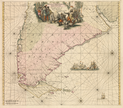 Chronological maps of the Magellan Strait, Pacific Ocean, and Spice Islands (Moluccas) form the backdrop to exhibition cases devoted to individual explorers and explorer-pairs: Ferdinand Magellan (d. 1521), Alvaro de Mendaña de Neira (1542?-1595) and Pedro Fernandes de Queirós (d. 1615), Sir Francis Drake (1540?-1596), Jacques Le Maire (1585-1616) and Willem Corneliszoon Schouten (d. 1625), Abel Janszoon Tasman (1603?-1659), William Dampier (1651-1715), Jacob Roggeveen (1659-1729), Samuel Wallis (1728-1795) and Philip Carteret (d. 1796), Louis-Antoine de Bougainville (1729-1811), and James Cook (1728-1779).