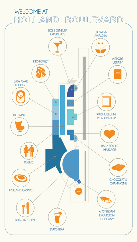 In order to create an ambience where passengers can feel at home, “living rooms” have been developed on Holland Boulevard — cozy spaces featuring fireplaces, television sets and even a piano, providing a spot to sit back and relax, with both young and old in mind. There’s even a Babycare Lounge that caters to infant needs. At KidsForest, younger children can play in tree huts, on climbing frames and slides.