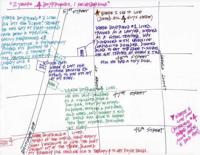 The Hand Drawn Map Association is an ongoing website project to archive user submitted hand-drawn maps and other interesting diagrams. The association was created by Philadelphia based artist Kris Harzinski who has collected his favorite maps from the collection to make his book, from Here to There . There are all kinds of maps in this book from the quick “Visit me” directional map to the more intriguing “I heard you broke up with your girlfriend”, here’s how to find me, map. There’s also found maps, fictional maps, art maps and