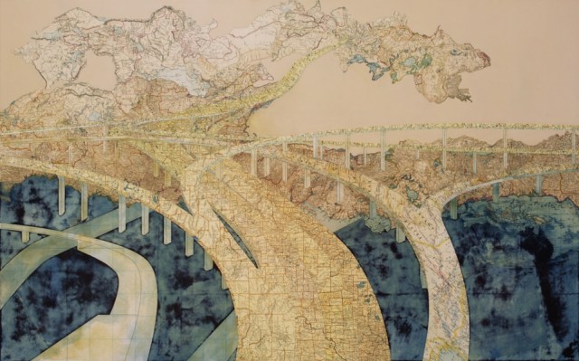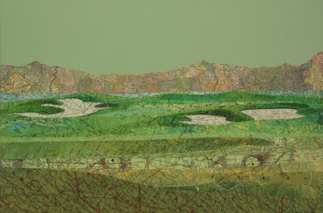 New York City born, Dallas-based artist Matthew Cusick creates these ethereal images using maps, atlas pages, books, acrylics, coffee, wood and aluminum.