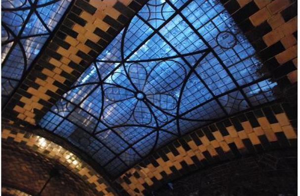 The station is nearly 400 feet long, curved with nary a straight line in sight. Fifteen colorfully tiled arches support the decorative ceiling and blue glass skylights.