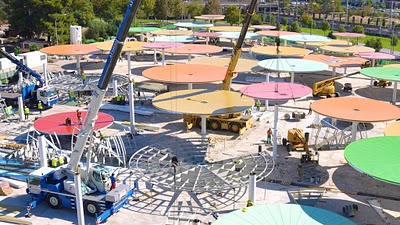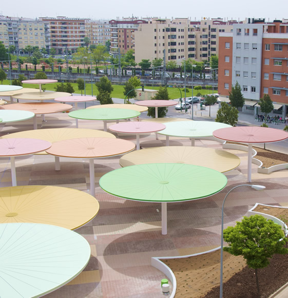 The steel umbrellas, with diameters between 21 and 45 feet, bring color and a bit of fun to the city’s dull modern center. You can watch a fascinating Youtube video on the design, development and installation of the project.