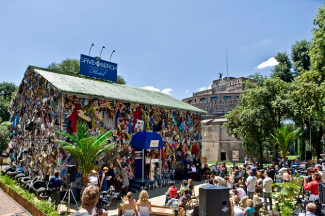 Yesterday was the last opportunity to spend the night in Madrid’s Corona “Save the Beach Hotel”. The five room temporary rubbish B&B was designed by German eco-artist Ha Schult and was built of 12 tons of garbage collected from beaches in Italy, Spain, Belgium and France. Even the wallpaper was a colorful collage of trash from landfills.