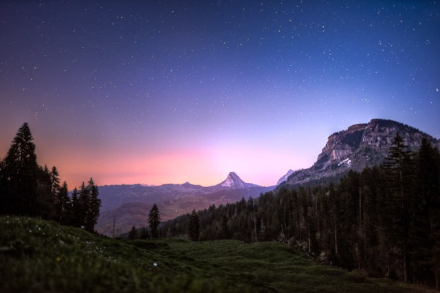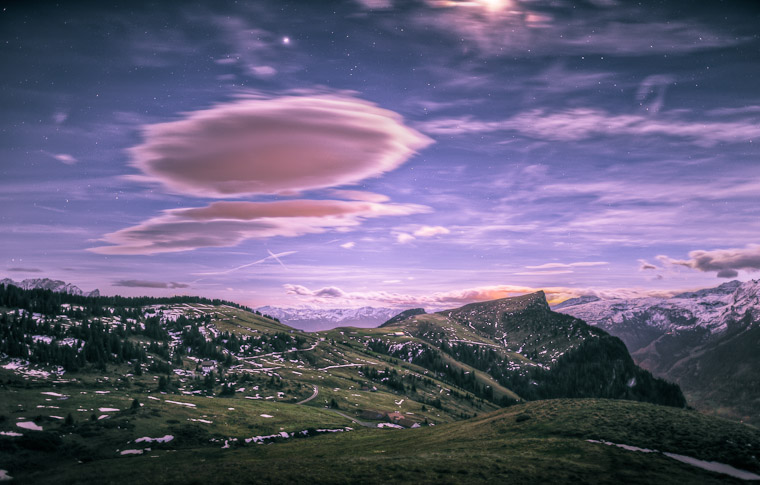 The crescent Moon, rising Sun and the planet Venus are all visible in this astonishing photograph taken by David Kaplan last Sunday in Eastern Switzerland.The lights from the Swiss village of Trübbach illuminate the clouds above the Mitterspitz.