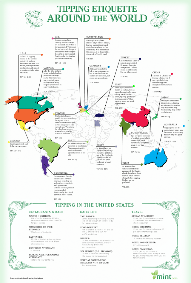 After a long discussion with visitors from Europe on tipping practices in the Americas, this infographic seems to be just the ticket to solve the mystery.
