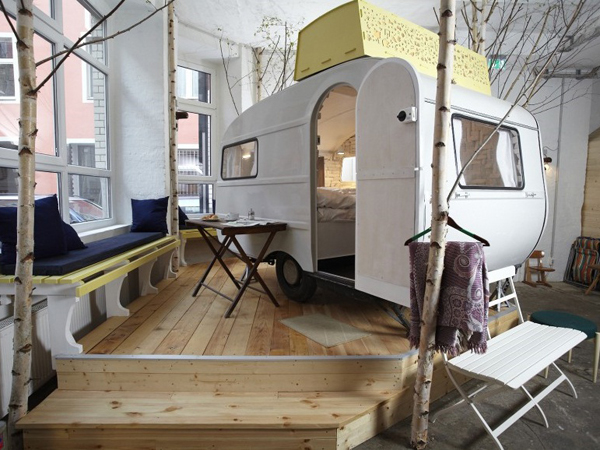 The Hüttenpalast is Berlin’s newest hotel concept. Created by Sike Lorenzen and Sarah Vollmer, it’s situated in the less than chic Neukölln district just southeast of trendy Kreuzberg. The new hotel consists of a cluster of renovated mini-campers and small wooden huts set within a defunct vacuum cleaner factory.