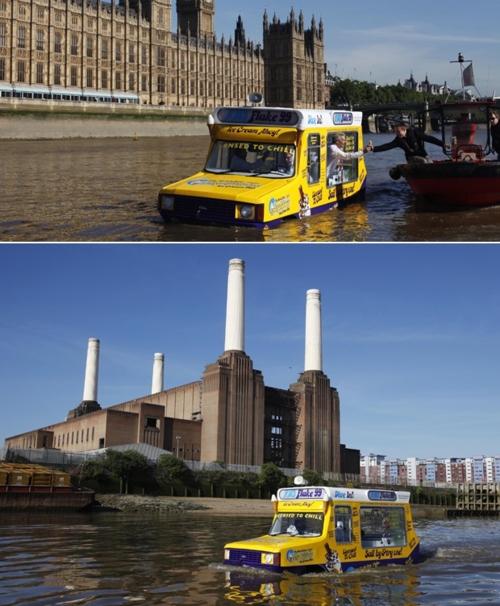HMS Flake 99, the world’s first amphibious ice cream truck, took its maiden voyage on the Thames in London this week. Captained by comedian David Mounfield, who won a contest for the post, the sea-going ice cream truck was commissioned by Cadbury in honor of National Ice Cream Week. The HMS Flake 99, which has a top speed of 5 knots, will be turning up on waterways and beaches throughout Britain this summer and it may even sail across the Channel to visit the Continent.