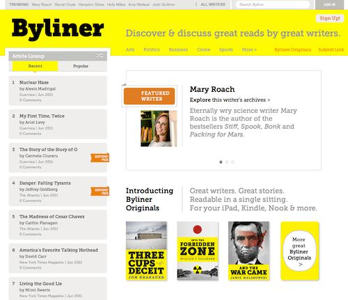 Byliner.com, which launched last week, offers a recommendation service that suggests new writers that users might like. It also provides indepth author profile pages (free to writers). Byliner was created to function as a subsidiary of Byliners Originals, which produces and markets digital works of nonfiction. The platform’s early offerings include original works by William T. Vollmann, Mary Roach, Anthony Swofford and Jon Krakauer.