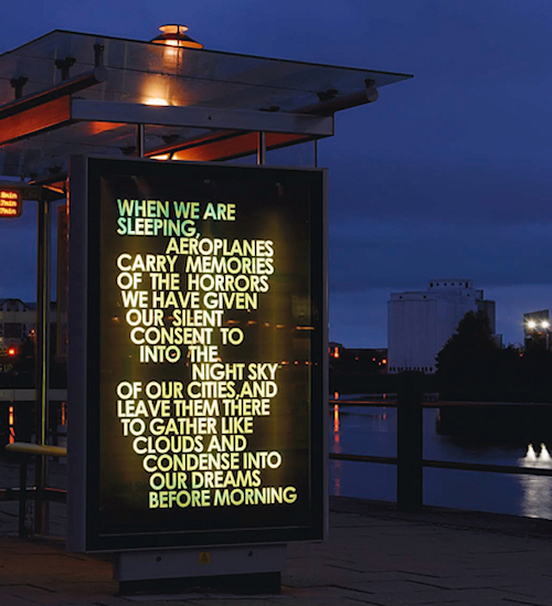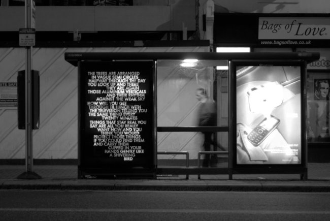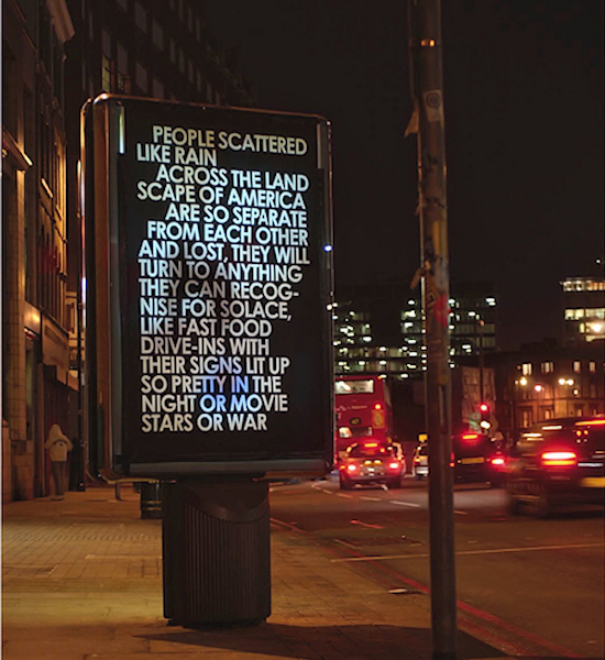 For the past six years, London-based artist/poet Robert Montgomery has carried out a project that he calls WORDS IN THE CITY AT NIGHT , where he hijacks commercial and public advertising space in cities, often unlawfully. He covers illuminated ad space with black posters with white lettering, which takes on the color scheme of the advertising beneath. Montgomery’s texts are poetic explorations of the collective unconscious.
