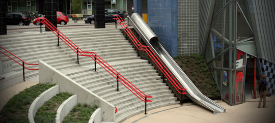 It’s officially dubbed the “travel accelerator” by Netherlands Railway, but to the folks in Utrecht it’s de glijbaan and it’s just plain fun. Open for about two weeks, the slide has been a huge success.Installed along the stairway at the newly renovated Utrecht Overvecht stattion, the way cool slide offers commuters and travelers a quick way to the train platform. The only down side is that it doesn’t function well in the rain.