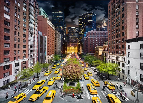 Wilkes creates his intense images by setting up cameras above iconic New York locales, taking hundreds of shots from dusk to dawn. he then blends the photos into one large, dramatic image, creating an original hybrid scene.