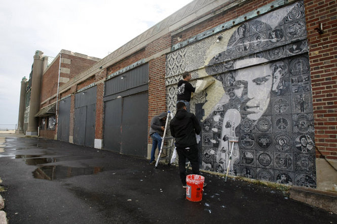 Last week celebrated artist Shepard Fairey left his calling card on the walls of Asbury Park, New Jersey. The mural, titled “The Rebel Waltz”, was part of the “All Tomorrow’s parties” music festival.