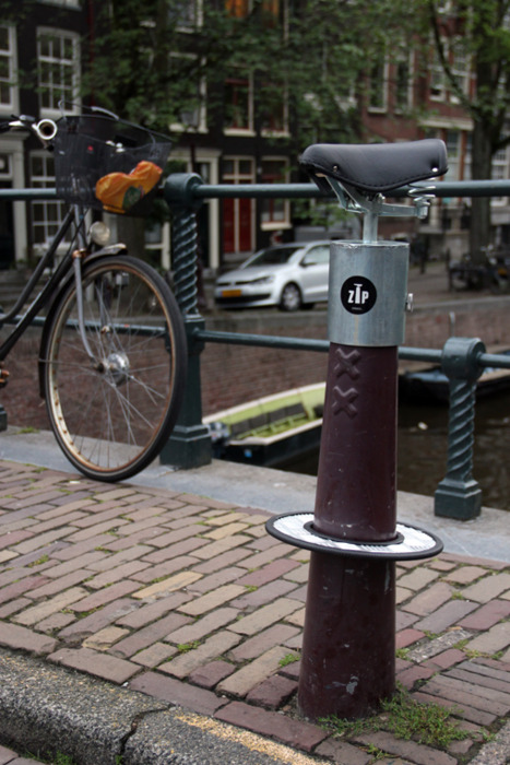 Combining two ubiquitous symbols of Amsterdam—bikes and bollards—Zipaaltjes are new iconic features of the Amsterdam cityscape. The Zip project is designed to encourage rediscovery of public space by offering a comfortable place to enjoy the city. It invites Amsterdamers and visitors alike to consider the street as a social space instead of the domain of traffic. And Zip is all about re-use, recycling and re-examining the urban environment.