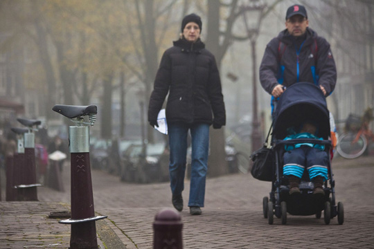 The nifty street-seats are fashioned from classic Dutch bike seats, which are randomly attached to amsterdammertjes along with nifty footrests for comfort. The project is the brainchild of the Jihyun David design group of Amsterdam and Turin, Italy. You find out more about the many projects by Jihyun Ryou and David Artuffo at the blog Ottantaocchi and Zipaaltje .