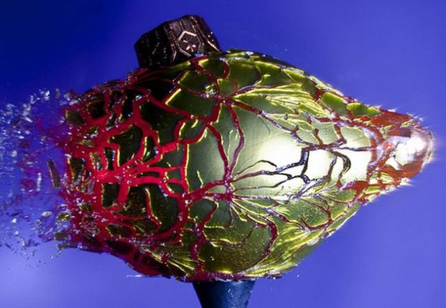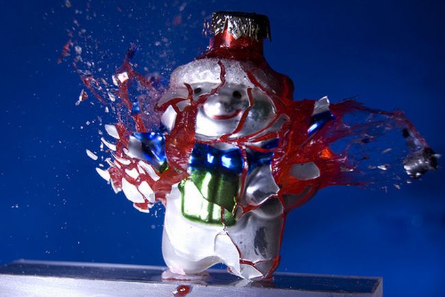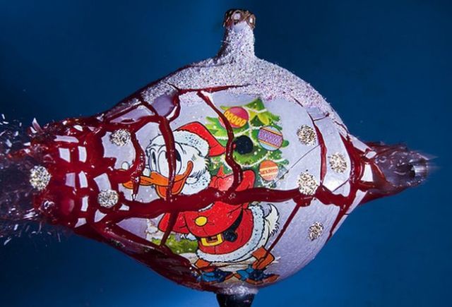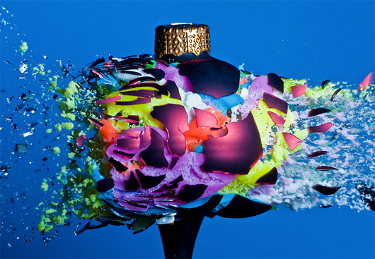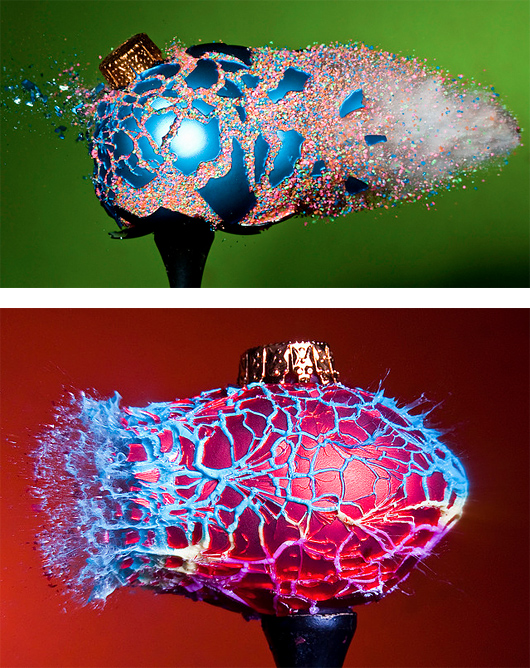 California-based photographer Alan Sailer has been shooting-up colorful Christmas ornaments with a high-speed pellet gun and photographing the process utilizing a homemade air-gap microflash system. Sailer enhances the effects by filling the ornaments with jellos, beads, colored sands, Play-Doh and various liquids. The clever project has been titled “The War Against Christmas”.