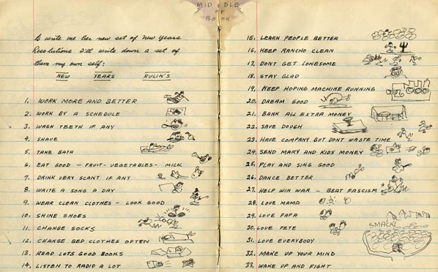 I never make New Year’s resolutions, but the late great Woody Gutherie did. Here’s the list that he wrote in 1942 at the age of 30.