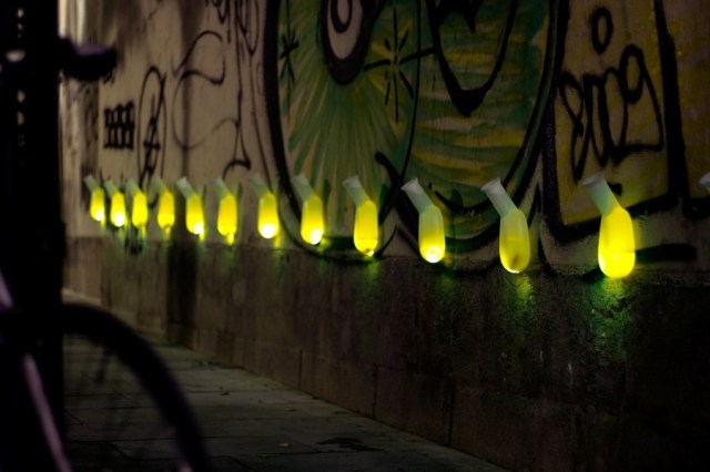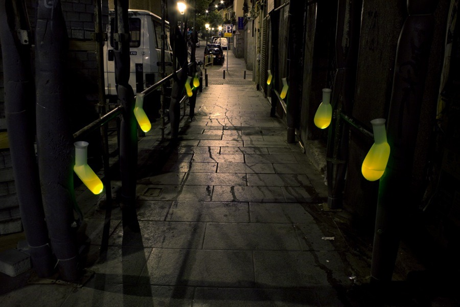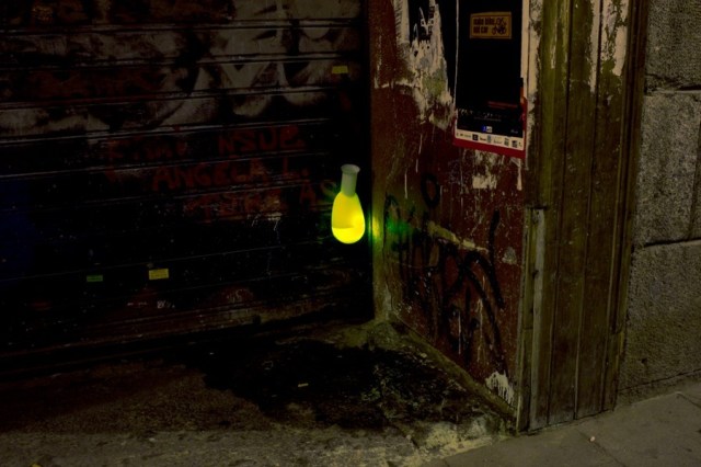 The popular Spanish street art collective known as Luzinterruptus has created a humorous and dramatic installation that sheds light on a common urban problem. Portable hospital urinals were filled with yellow tinted water and led lights and then attached to poles, trees and walls in Madrid’s Plaza de San Ildefonso. According to Luzinterruptus, “during the day and at night people urinate anywhere in the street without embarrassment … Through our installation we have tried to attract attention—in a comical way—about problems we encounter when walking centric streets and squares.”