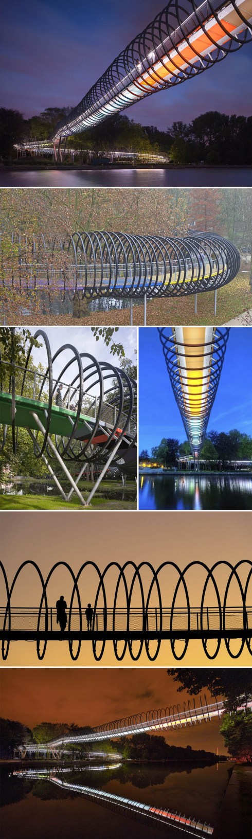 The Slinky Springs Bridge in Oberhausen, Germany was completed in the summer of 2011. Based on designs by Frankfurt artist Tobias Rehberger, the funky bridge drew its inspiration from the iconic Slinky children’s toy. Rehberger captured the wild, fun qualities of the Slinky in his spiraling bridge across the Rhein-Herne-Kanal. The bridge was actually constructed by structural engineers Schlaich Bergmann out of 496 aluminium coils that span more than 400 meters. I only wonder why my pals Bo and Carolin didn’t tell me about this.