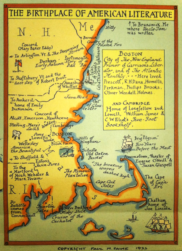 Created in 1933 by cartographer Paul M. Paine, The Booklovers Map of America Showing Certain Landmarks of Literary Geography is a charming guide to many of our favorite literary places. Working during the 1920s and 1930s, Paine designed or co-designed  some terrific pictoral maps, including The Booklovers Map of the British Isles and the better known Map History of New York State. While some may disagree with Paine’s designation of Boston as “the Birthplace of American Literature his maps is a creative and entertaining take on our literary heritage.