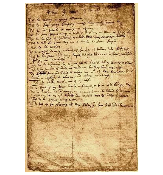 “When I come to be old. 1699. Not to marry a young Woman. Not to keep young Company unless they reely desire it. Not to be peevish or morose, or suspicious. Not to scorn present Ways, or Wits, or Fashions, or Men, or War, &c. Not to be fond of Children, or let them come near me hardly. Not to tell the same story over and over to the same People. Not to be covetous. Not to neglect decency, or cleenlyness, for fear of falling into Nastyness. Not to be over severe with young People, but give Allowances for their youthfull follyes and weaknesses. Not to be influenced by, or give ear to knavish tatling servants, or others. Not to be too free of advise, nor trouble any but those that desire it. To desire some good Friends to inform me wch of these Resolutions I break, or neglect, and wherein; and reform accordingly. Not to talk much, nor of my self. Not to boast of my former beauty, or strength, or favor with Ladyes, &c. Not to hearken to Flatteryes, nor conceive I can be beloved by a young woman, et eos qui hereditatem captant, odisse ac vitare. Not to be positive or opiniative. Not to sett up for observing all these Rules; for fear I should observe none.