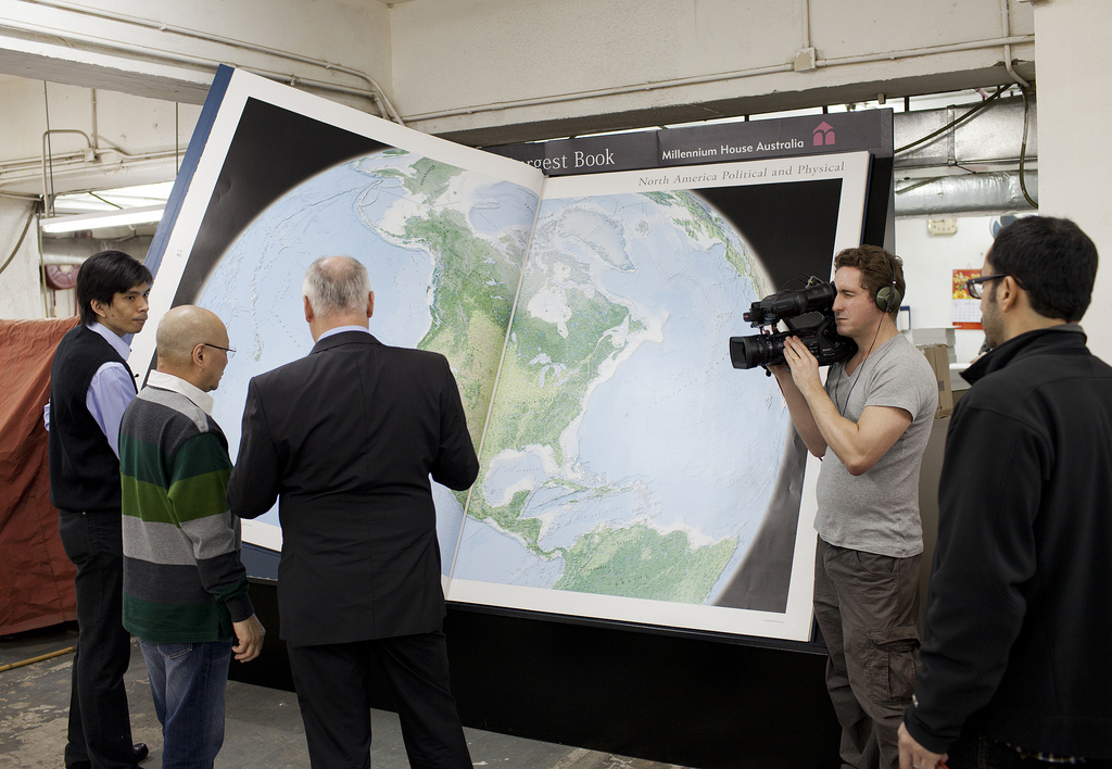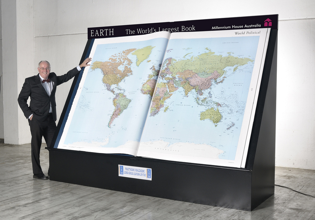 Earth Platinum, the brainchild of Gordon Cheers, published at the end of February in an edition limited to 31 copies, is the world’s largest atlas. The book is 6 feet (1.8 m) high and 4.5 feet (1.4 m) wide. When fully open, it spans 9 feet (2.8 m). It contains 128 pages of maps, flags and panoramic photographs, and weighs over 300 lbs. The atlas can’t be used alone: it takes two people to turn over the enormous pages.