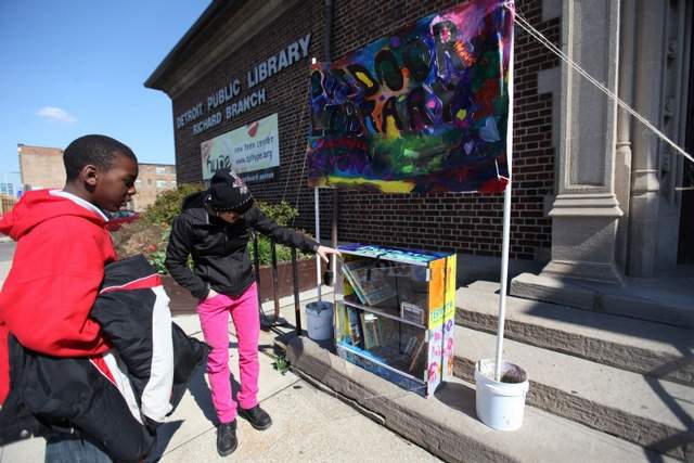 The 4th grade class at Detroit’s Marcus Garvey Academy, with help from University of Michigan instructor Melanie Manos, designed an alternative library for their community. The students built and installed waterproof bookcases for their outdoor library and set-up in front of a shuttered local library branch. After an outpouring of local support, the kids created five more free outdoor libraries. Each operates on the honor system and is sustained by donated books.