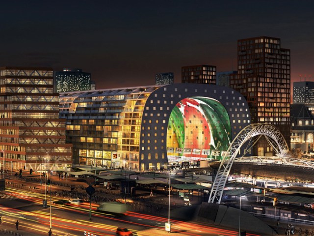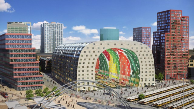 The currently under construction Rotterdam Market Hall is the latest in a series of cutting-edge building projects that we’ve come to expect from bustling Rotterdam. Designed by MVRDV architects, the enormous, towering 100,000 square meter tunnel-shaped building will combine a green market, restaurants, shopping and residences under one giant roof. The apartments will have spectacular views from windows overlooking the marketplace.