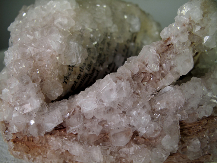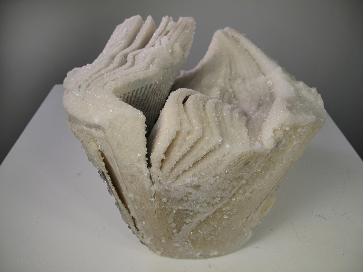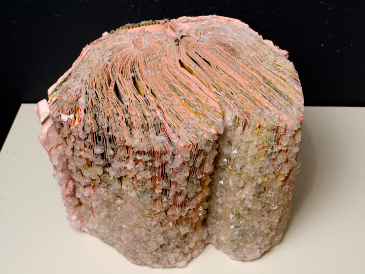 San Francisco-based sculptor and installation artist Alexis Arnold has a unique approach to the exploration of nature and time on common objects. Arnold transforms books and magazines into mysterious crystaline forms using borax crystals, water and time.For the artist, “The crystal growth highlights or creates the aesthetic of these once-utilitarian objects that are entering the world of obsolescence.”
