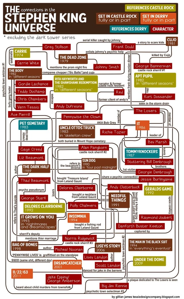 Australian artist/fabric designer Gillian James has been an avid Stephen King fan since the 5th grade when she surreptitiously read a purloined copy of Carrie. Now she has created a massive infographic tribute to Stephen King’s novels outlining the connections among characters and books. I’ve met a few obsessive Stephen King fans over the years, but none quite this compulsive.