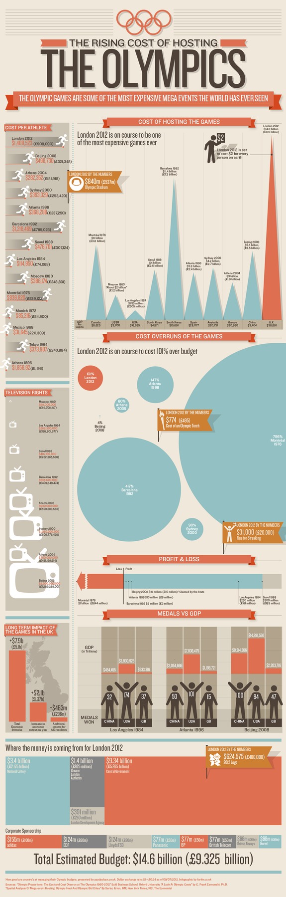 Now that we are immersed in the quadrennial celebration of all things sport, it may be an appropriate moment to stop and examine the true costs of all this hoopla. After seeing exactly what the 2012 Olympic Games is costing London and the British taxpayers, other cities may have second thoughts about bidding on future Olympics. You can certainly build a lot of schools, hospitals, parks, community centers and bridges for $14.6 billion. What would you prefer your tax payments funded ?
