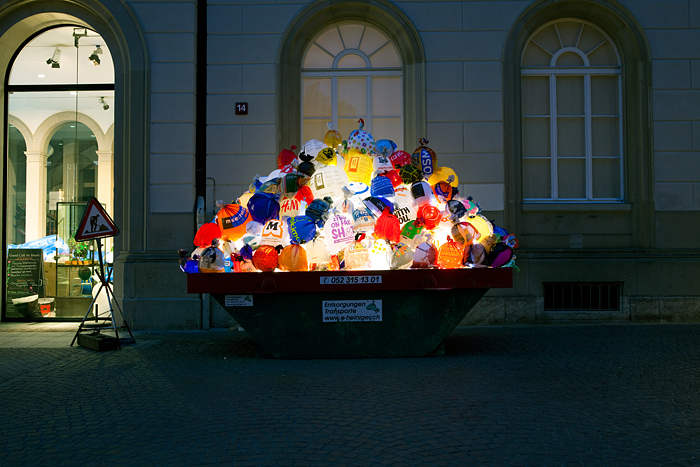 The work was commissioned by Winterthur, Switzerland‘s Gewerbemuseum to underscore the environmental impact of Europe’s conspicuous consumption as part of a series called “Oh, Plastiksack!”.