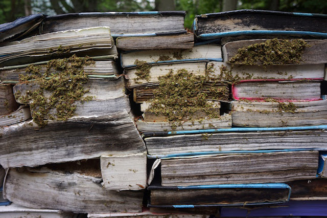 As you would expect, nature took its course and decay set in. But recently, the artists have started to help nature along by cultivating additional colorful fungi and moss on the books. I can’t wait to see what it will look like in another two years.