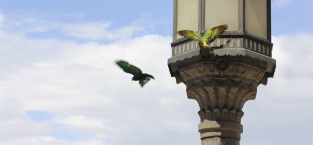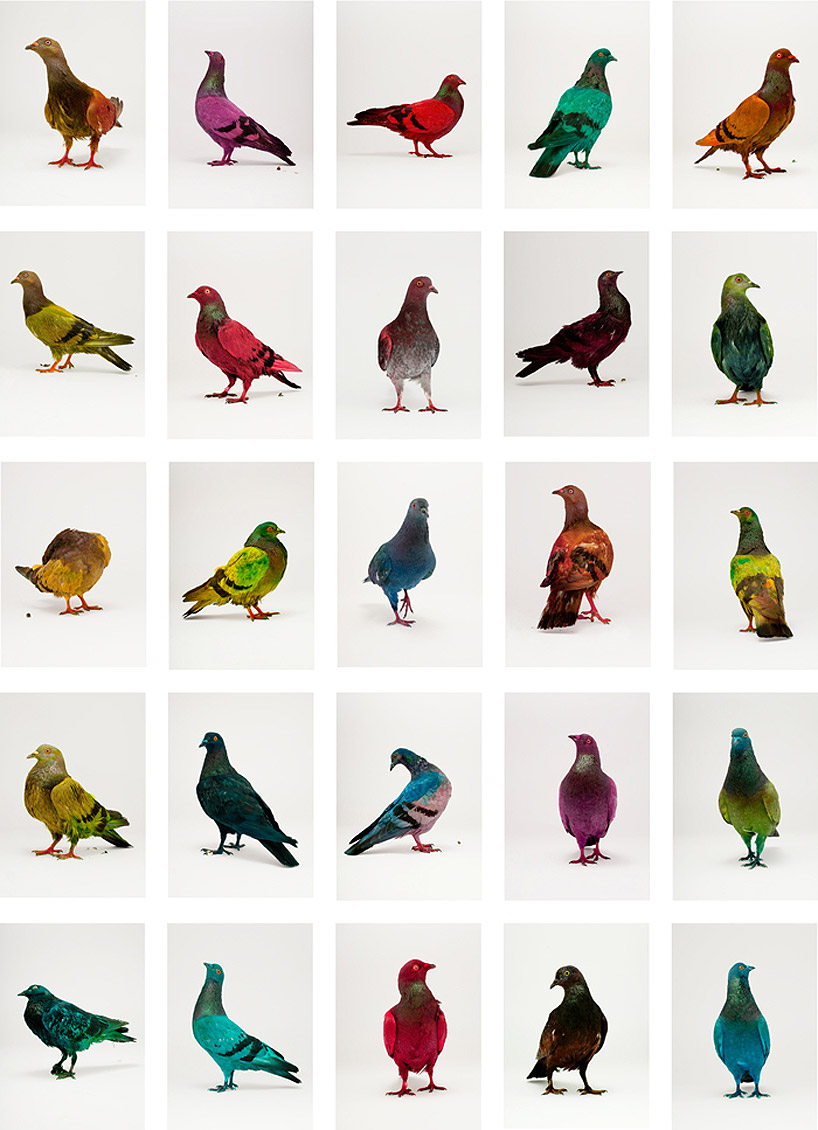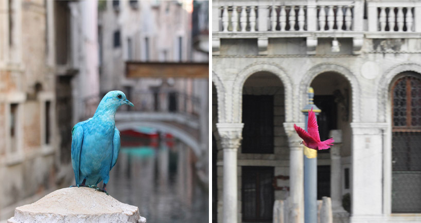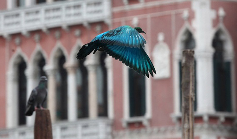 During the 2012 Venice Biennale, the Berlin-based team of Julian Charriere and Julian von Bismarck collaborated on a project to change public perception of Venice’s ubiquitous pigeon population. Utilizing natural dyes and a specially built box-conveyor system, the duo’s “Some pigeons are more equal than others” projected glammed-up Venice’s much maligned pigeon flock.