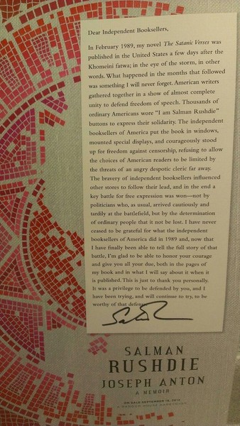 Salman Rushdie recently issued an open letter to independent booksellers expressing his gratitude for their long support of his work. The image below offers the full text of his message.