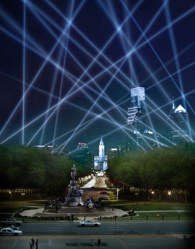 In this project, twenty four powerful searchlights create unique, dynamic light formations in the sky which react to voice messages sent by participants using a free mobile app and this website. The public is invited to record and submit messages of up to 30 seconds in length — shout-outs, poems, songs, rants, dedications, proposals. As the messages playback in Philadelphia, the lights react in brightness and position to the frequency and amplitude of the voice recordings, which can be heard through the mobile app, the website and public speakers located at the Project Information Center at Eakins Oval (24th Street and the Parkway).