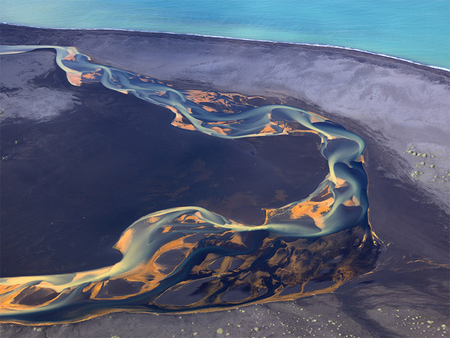 “Iceland is a wonderful country; I would even say that it is a true paradise for all the photo shooting-lovers. But what has become a real discovery for me is the bird’s eye view of the rivers flowing along the black volcanic sand. It is an inexpressible combination of colors, lines, and patterns. The photo represents the mouth of the river falling into the ocean. […] A little bit upstream there is a yellow-colored brook flowing into the river, but yellow currents fail to mix with the main water flow. One can estimate the scale judging by the car tracks that are clearly seen on the black sand. This is just a river, just a volcano, just our planet.”