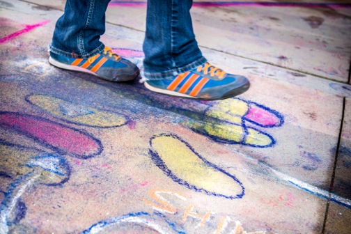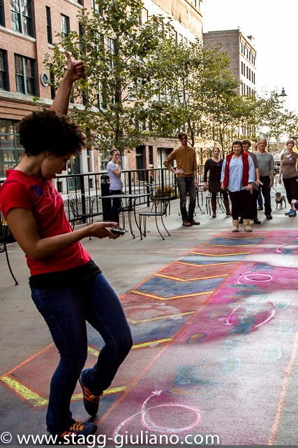 A series of five “dance spots”,prominently located throughout the Fort Point neighborhood, each area has a dance diagram drawn on the sidewalk with colorful chalks. Paired with a particular song, passers by can scan a QR code to hear the music, learn the dances via video, and see the dances performed by the artist.