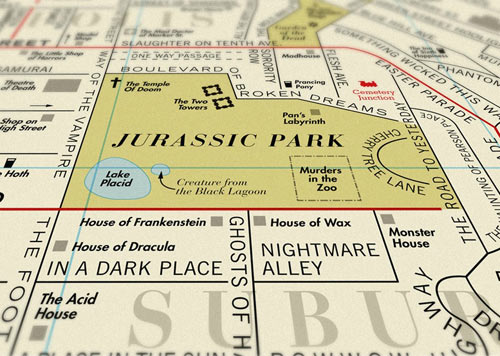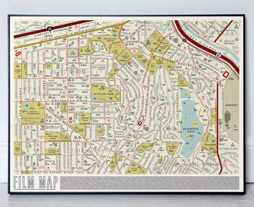 The witty folks at the British design group Dorothy created this faux-vintage map of Los Angeles based on film titles. The Film Map cannily incorporates more than 900 movie titles that replace the actual street names, sites and geographical features, such as Resevoir Dogs, Jurassic Park and Lost Highway . The fact-filled map key lists all of the films with director and release date.