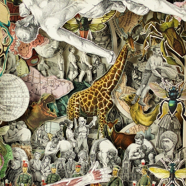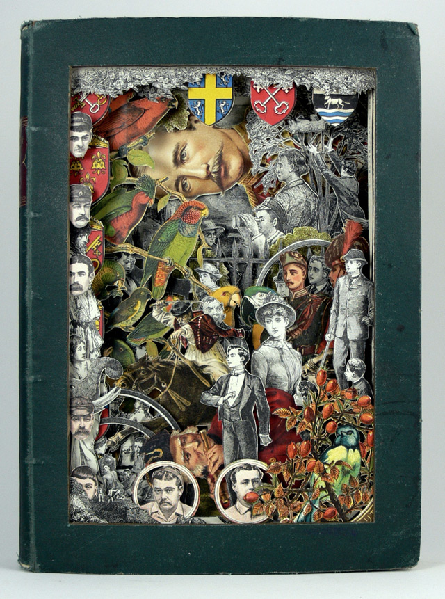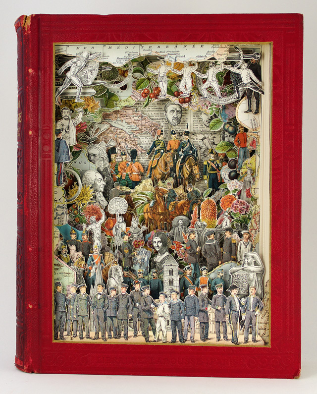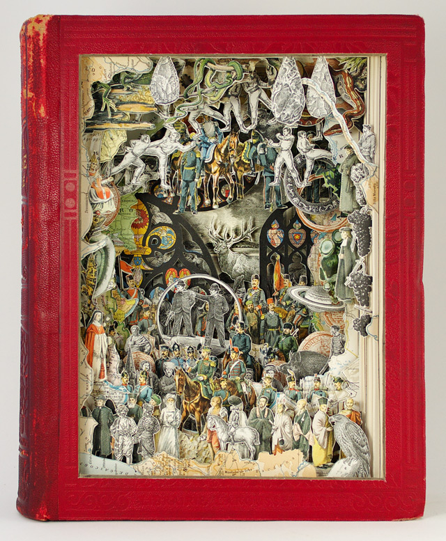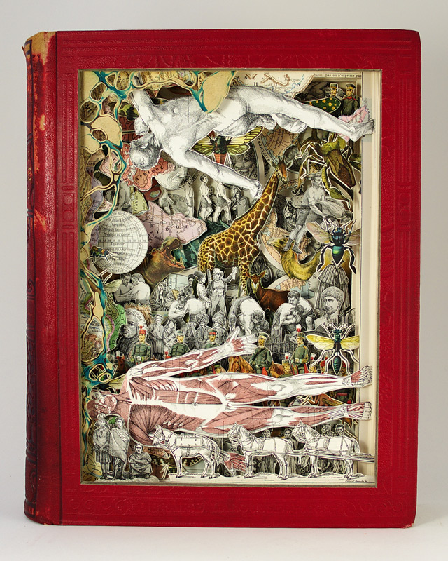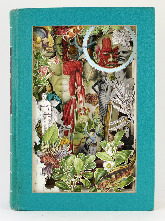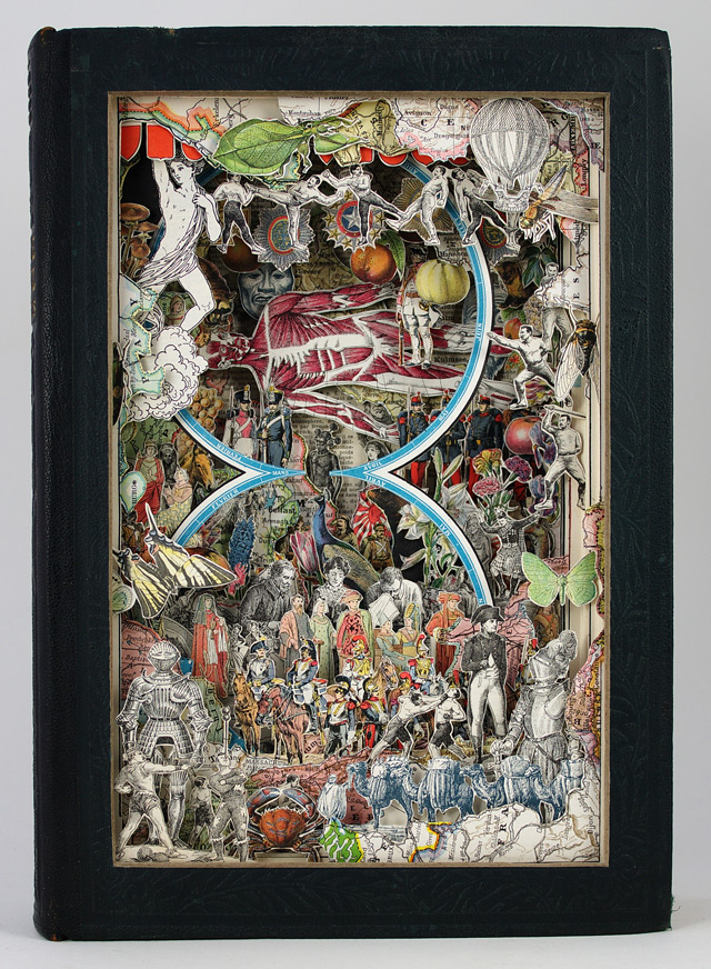 I admire the cut-out book collages of Alexander Korzer-Robinson, but still cringe a little at the evisceration of antiquarian books. He says of this work: “By using pre-existing media as a starting point, certain boundaries are set by the material, which I aim to transform through my process. Thus, an encyclopedia can become a window into an alternate world, much like lived reality becomes its alternate in remembered experience. These books, having been stripped of their utilitarian value by the passage of time, regain new purpose. They are no longer tools to learn about the world, but rather a means to gain insight about oneself.”