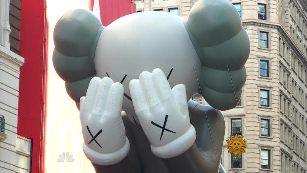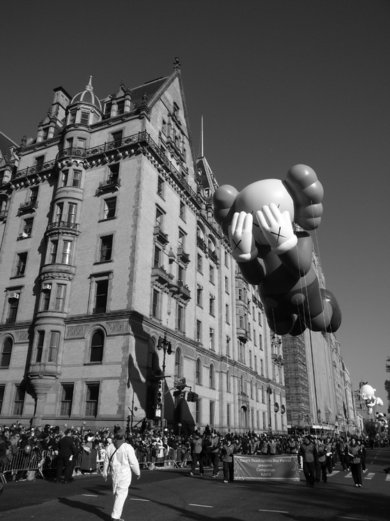 Of course I missed the actual broadcast of the Macy’s Thanksgiving Day Parade last week (good excuse: I was cooking for 15), so I was amazed to find that former street artist and fellow Jersey boy KAWS had a balloon in the parade. The Brookly-based artist, who is known as Brian Donnelly at home, is famous for his clever reworking of comic cultural icons and his subversive toys and sculpture. His surprising entry into the pantheon of beloved parade balloons was his curiously moving figure called “Companion”.