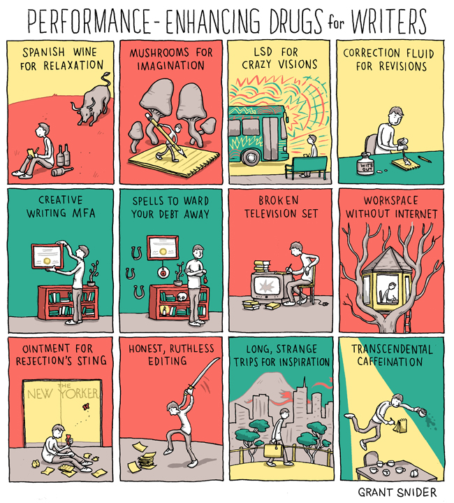 You may have seen Grant Snider’s terrific “Ban This Book” comic created to “celebrate” Banned Book Week this year. You might also be familiar with his brilliant “Haruki Murakami Bingo” comic which appeared in the New York Times , or you may even follow him at Incidental Comics. But if you’re not a big fan as yet, Snider’s latest work (see below) “Performance Enhancing Drugs for Writers” will win you over.
