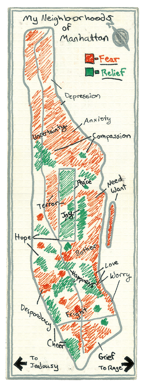 Becky Copoper walked the streets and boulevards of New York City’s borough of manhattan from end to end. Along the way she handed-out blank maps to ordinary New Yorkers and asked them to map their personal Manhattan and mail the map in to her.