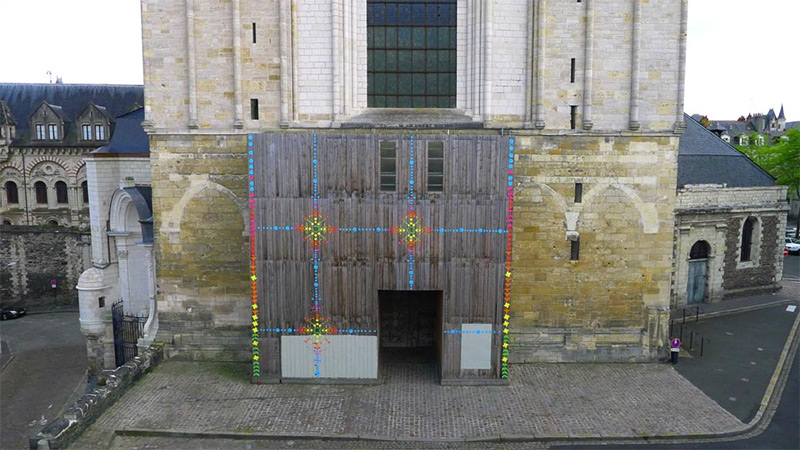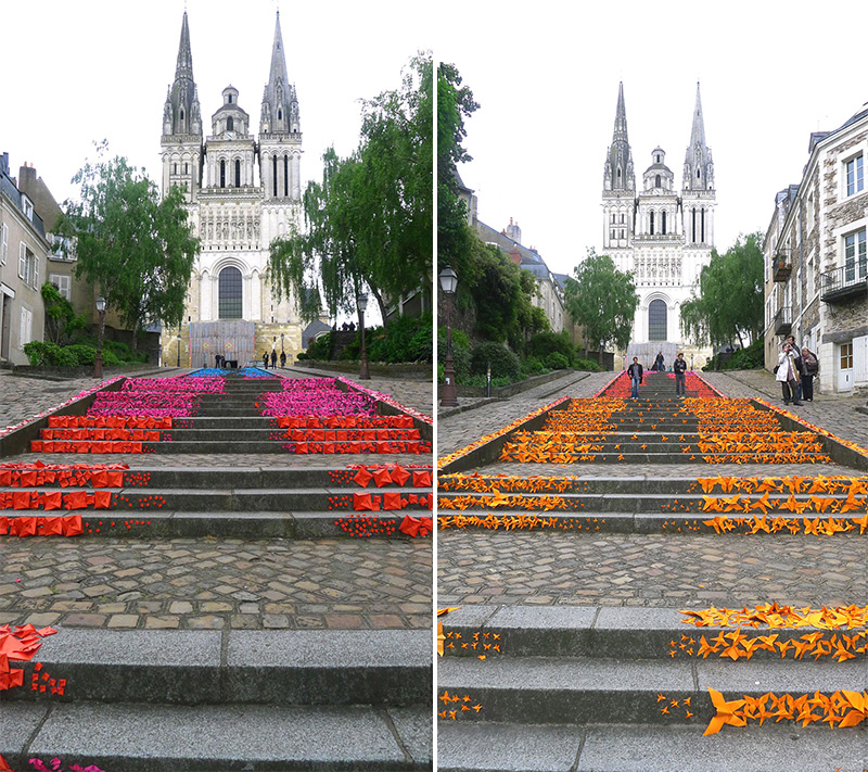 Paris-based French artist Mademoiselle Maurice recently called upon hundreds of volunteers to help complete a pair of street art installations in Angers, France for the artaq 2013 festival. The colorful works along the Maine River and on the approach to the Montée St-Maurice Cathedral required more than 30,000 pieces of origami folded by school kids, senior citizens and other helpers.