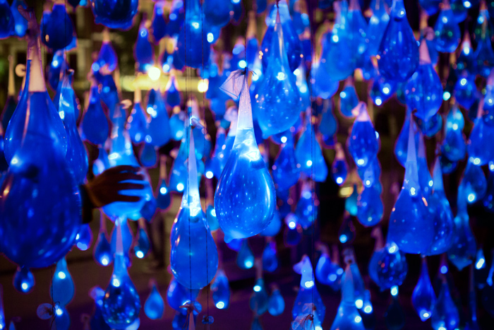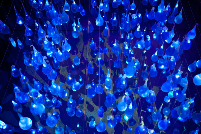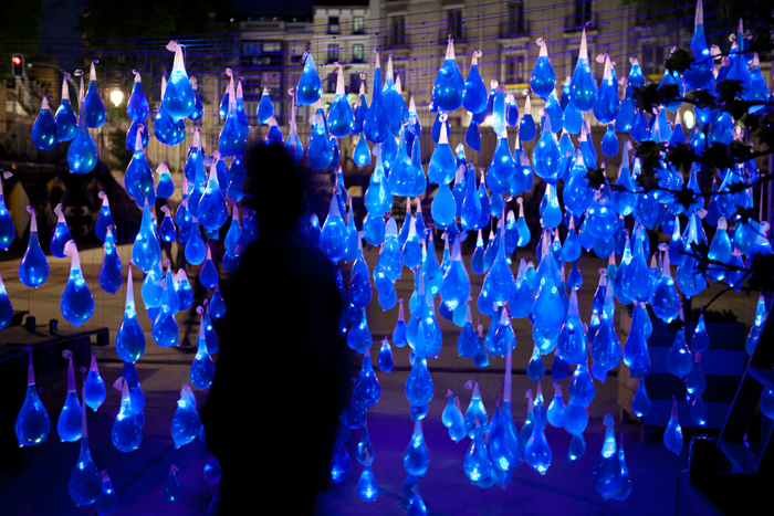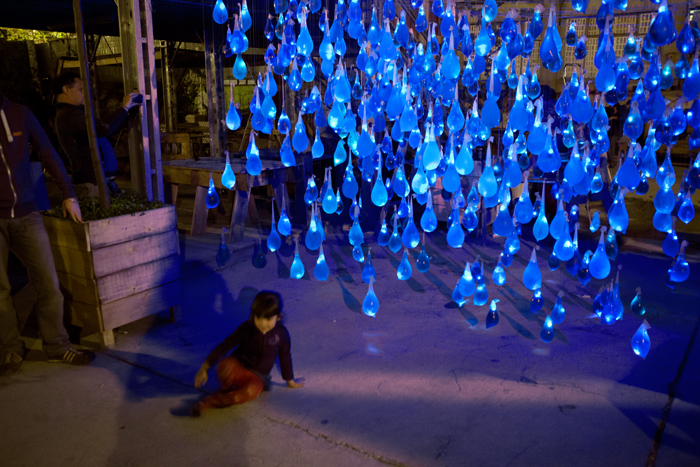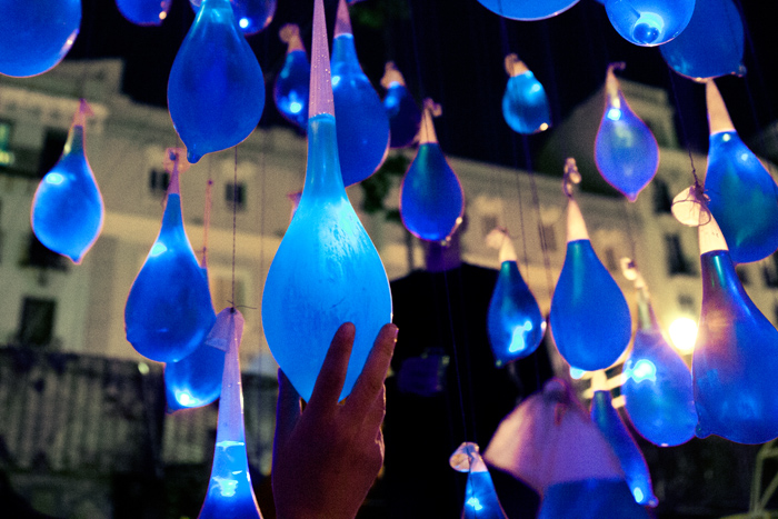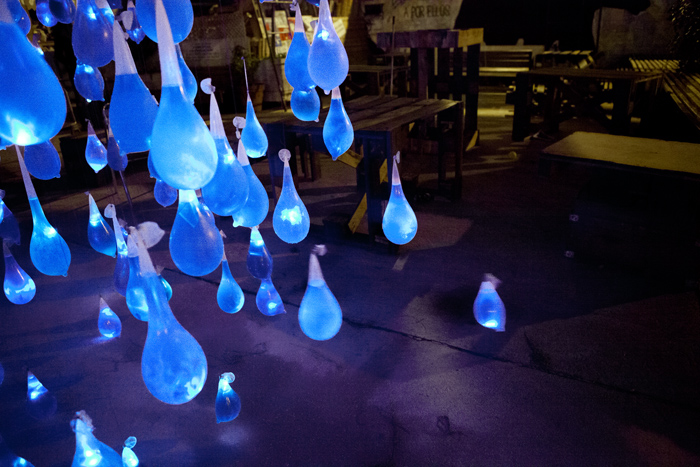 The project, called Lluvia Interactiva/Rain Interactive, was built around hundreds of water-filled condoms lit by LEDs. The widely popular installation had a brief life-span due to joyful piñata-like wacking by local kids.