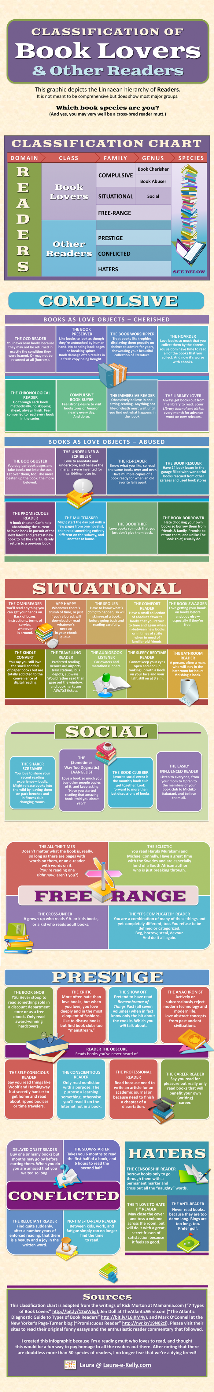 This brilliant infographic by Laura E. Kelly is an homage to the iconic Linnaean classification charts that most of us studied in science classes. But instead of plants and animals, Kelly describes and classifies “reader species”. If you’re a book lover, then you’re bound to find yourself somewhere on the infographic.