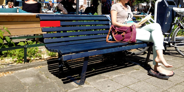 Actually, there’s not much that’s free in Amsterdam these days, but this summer visitors and residents alike have been discovering free books, magazines and newspapers attached to public benches around town by big, red metal clips. The Ruilbank, or barter benches, are a project spearheaded by Pivot Creative, a center-city design firm.
