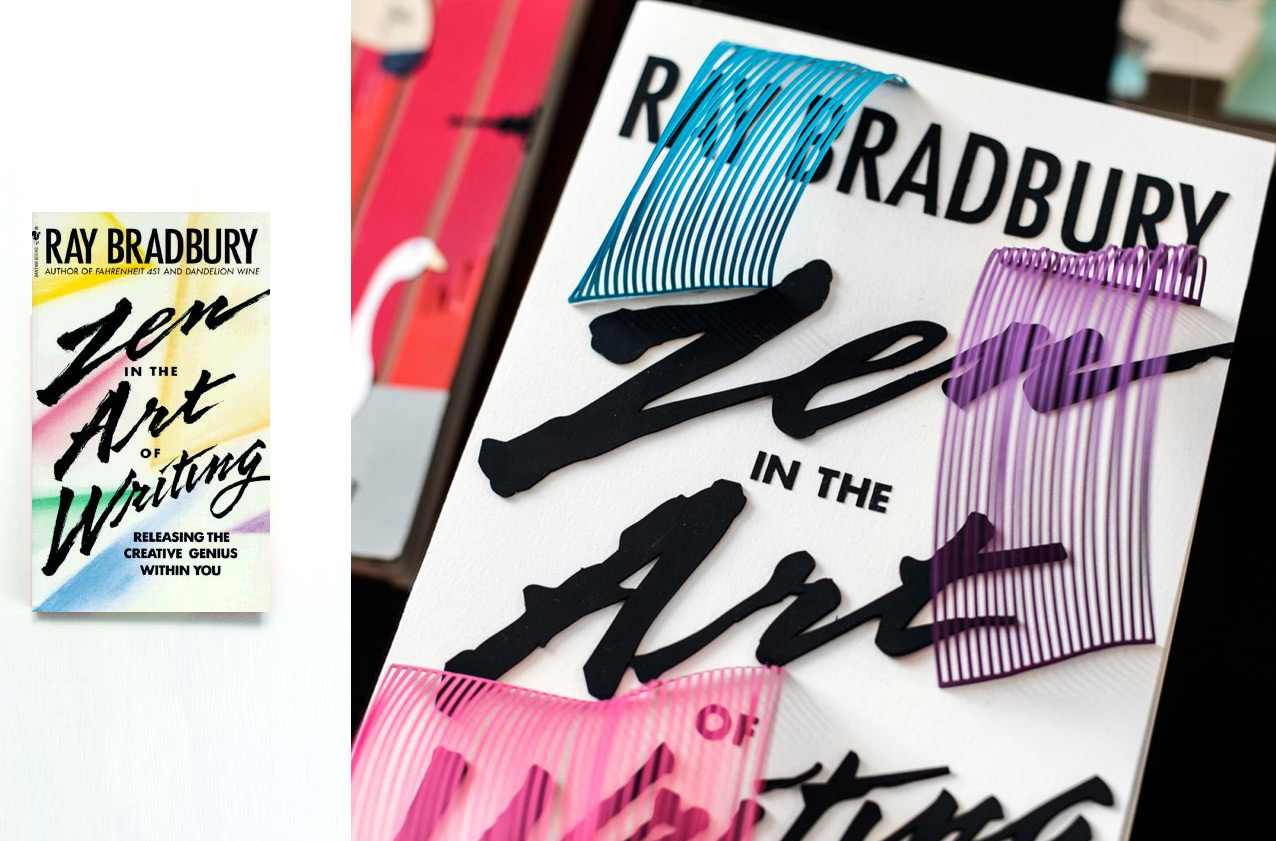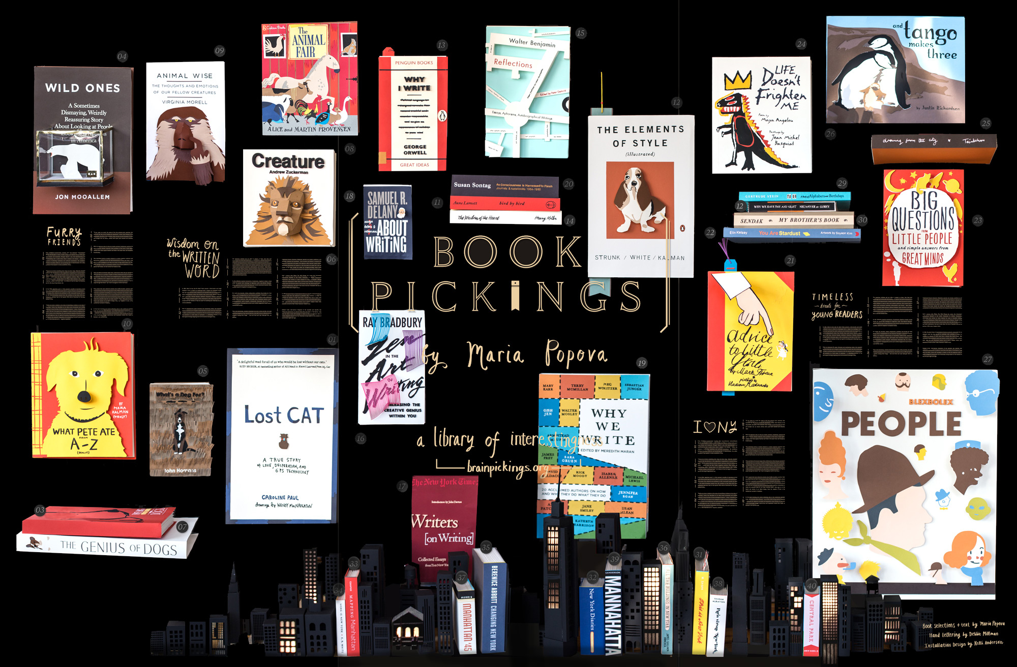 This summer, the Main Branch of the famed New York Public Library is featuring a wonderful book art installation by artist/designer Kelli Anderson and book blogger Maria Popova (Brain Pickings) . Titled “Big Books made of paper”, the fantastic installation is a charming diorama of books floating above a stylized New York City skyline. Each of the books has been painstakingly recreated in 3D cut paper.