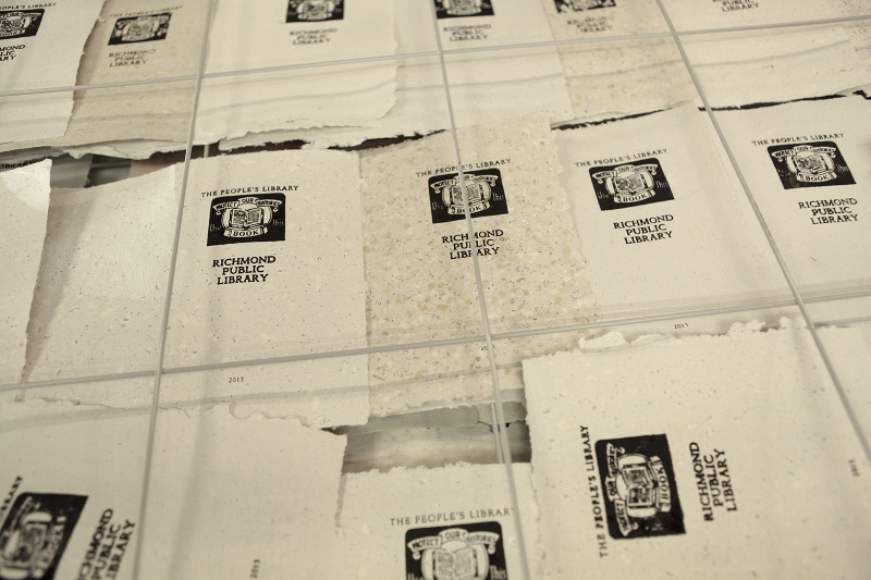 The People’s Library is creating a thousand books for any member of the Richmond community to take home and fill with their memoirs, histories or stories. The process begins with paper that has been sourced from 5,000 discarded books. The recycled pages are pulped, blended and dried to fabricate new paper. The book bindings are fashioned from the discarded books as well.